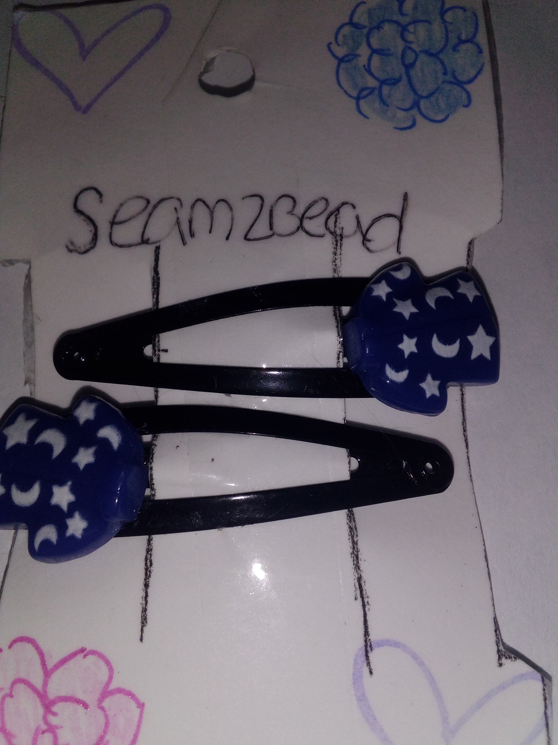 Blue t shirt with white stars (black hair clip)