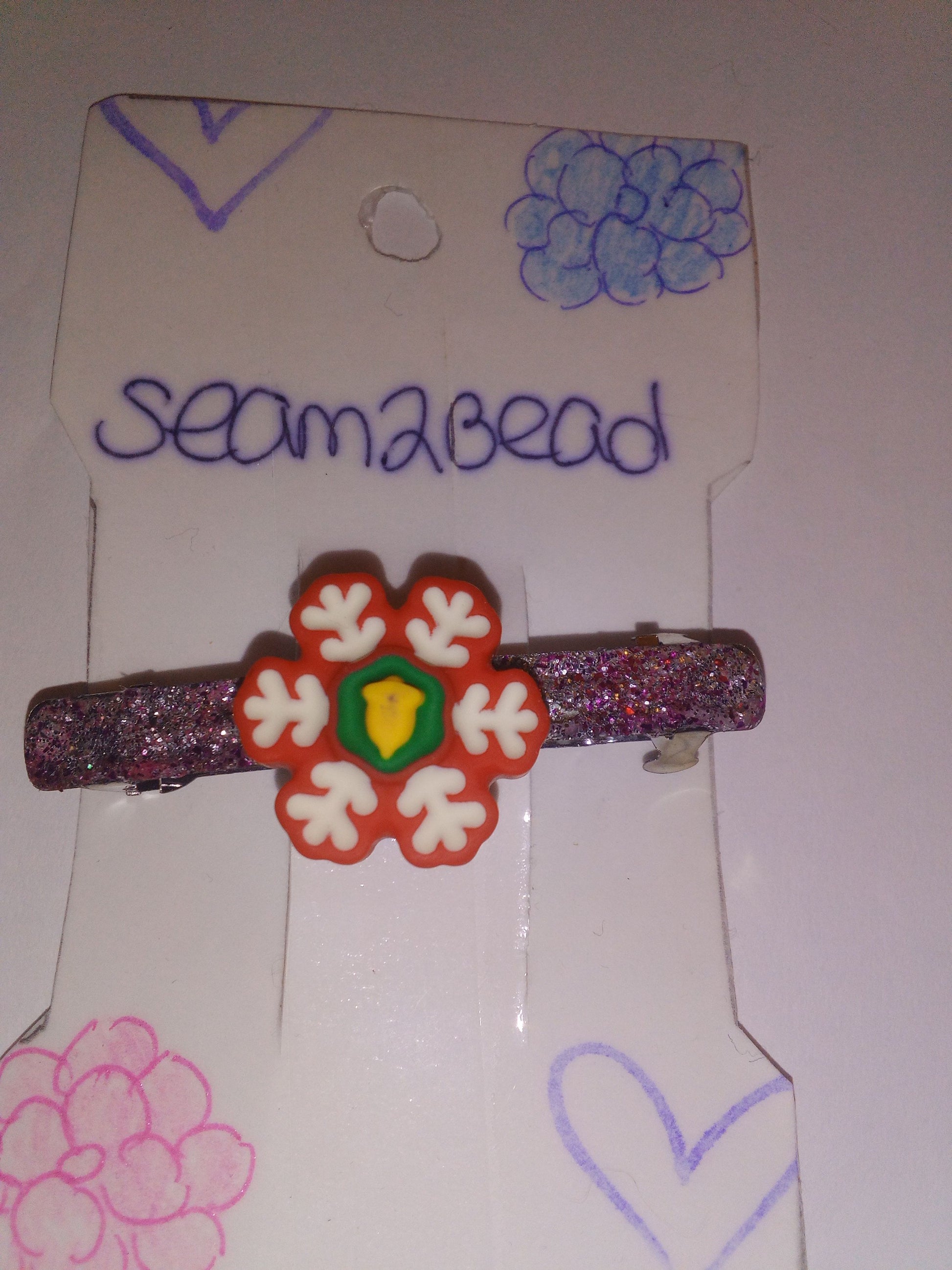 This hair clip that is made of nickel free sliver Barrett on it. It's also made of pink/sliver glitter with a red snow flake