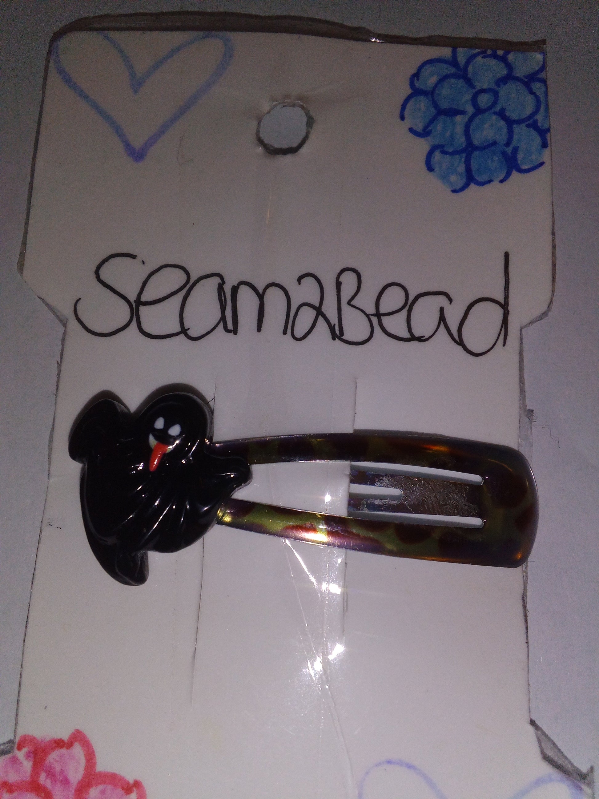 This hair clip that has plastic embellishment on it. This hair clip that has yellow/red spot hair clip