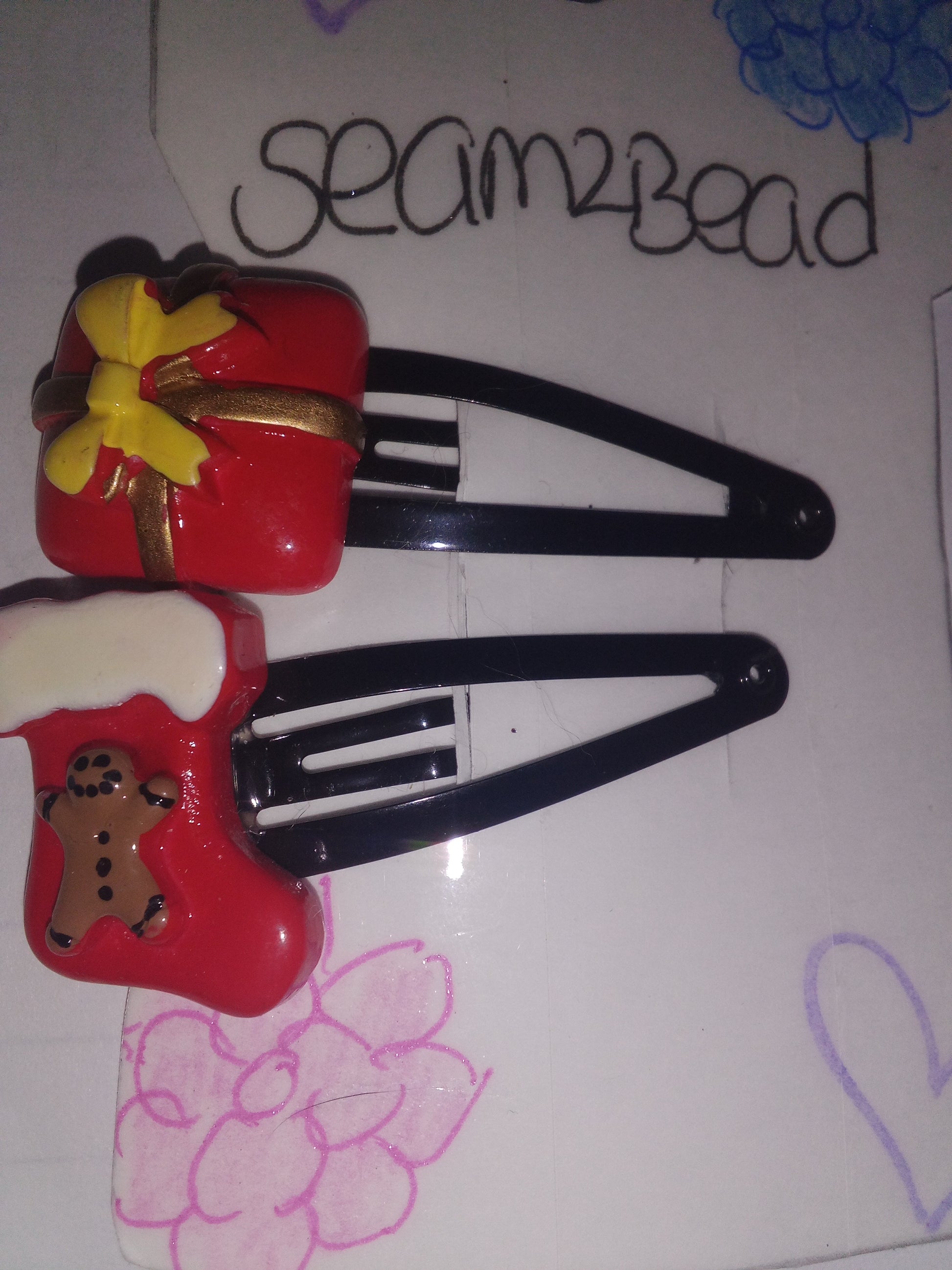 This hair clip that has plastic embellishments on it and it also made of black metal hair clip