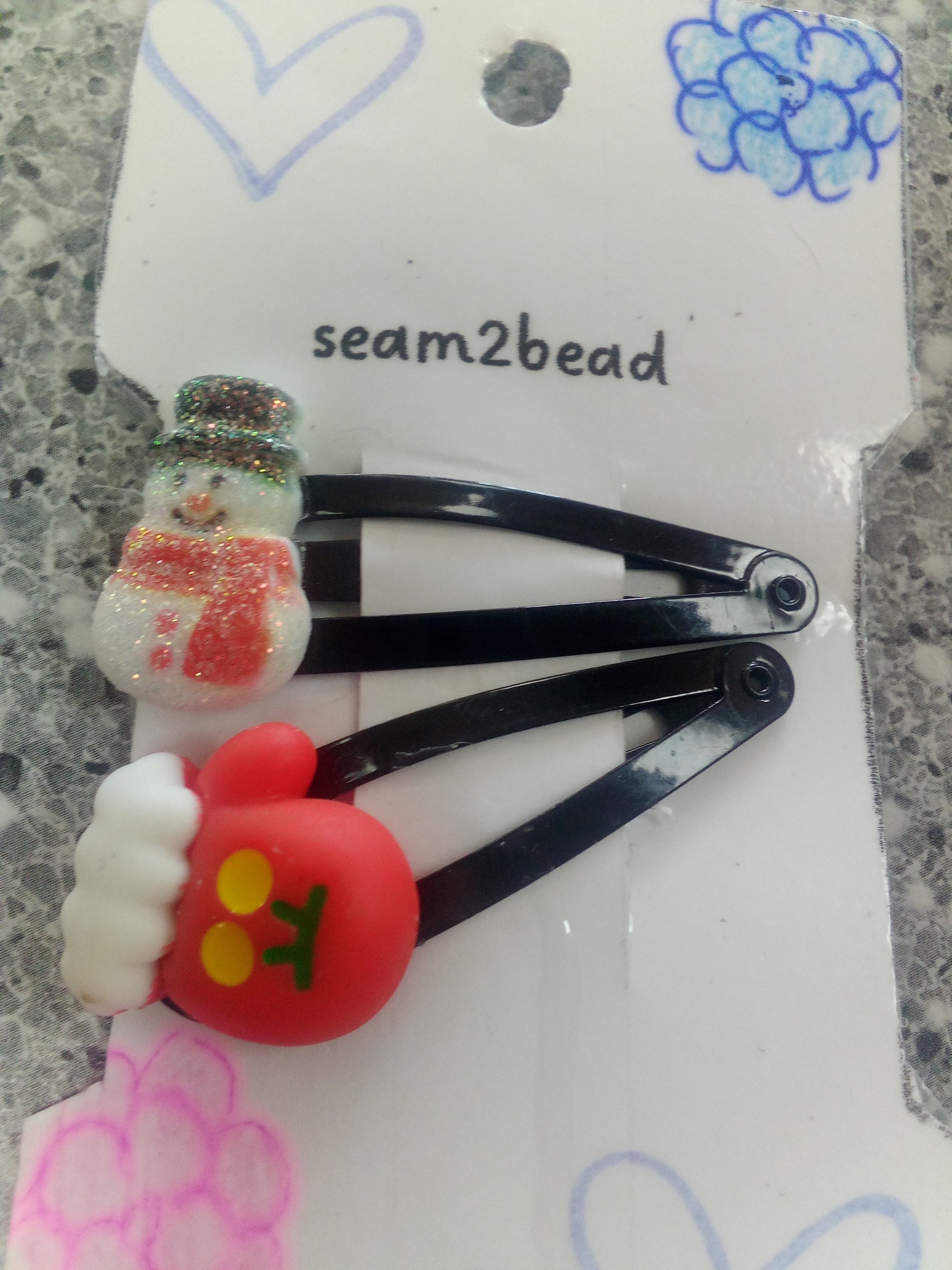 This hair clip that has a glitter snow man with a big mitten that has plastic embellishments on it. It's made of black metal hair clip
