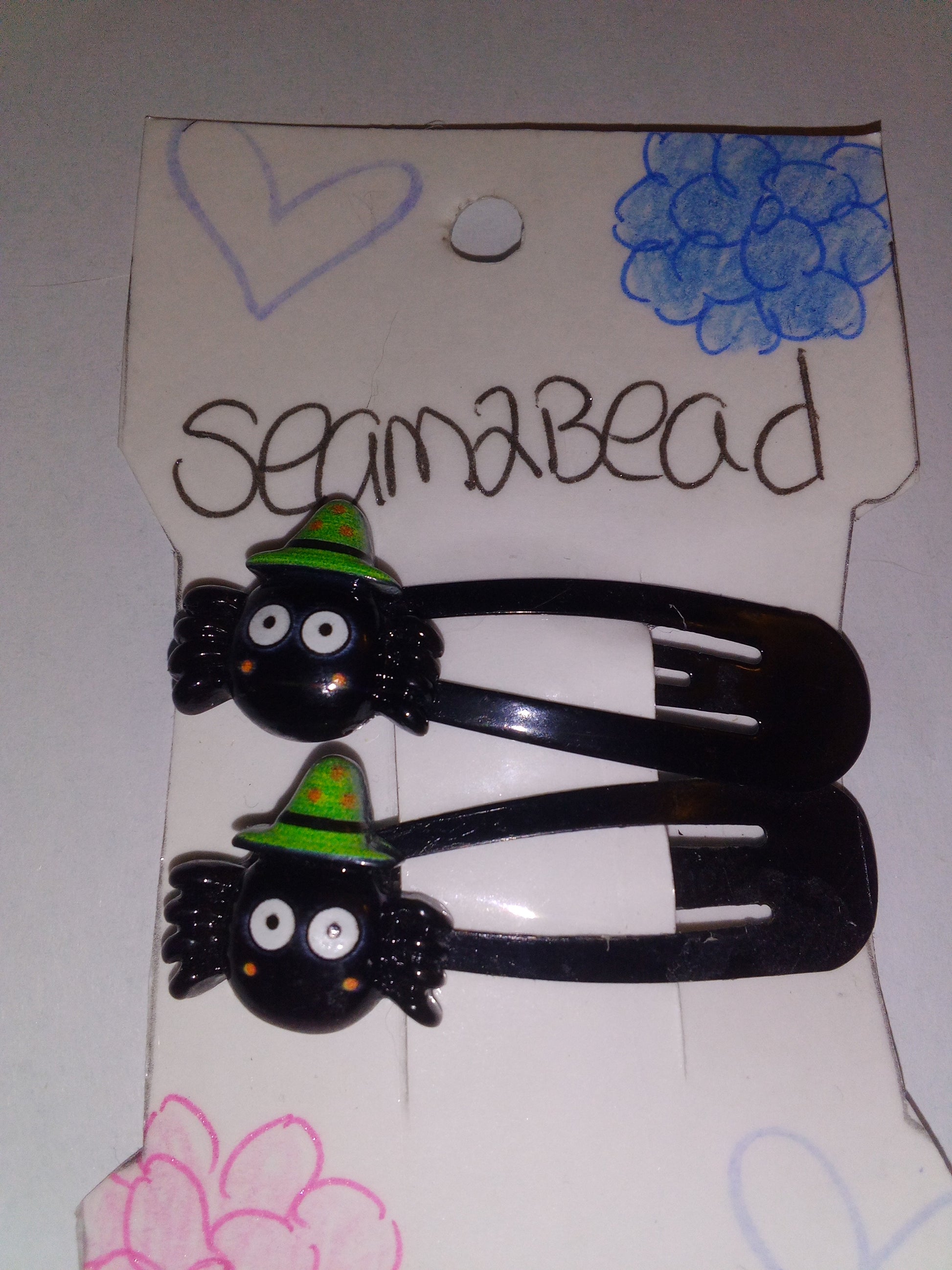 This Halloween hair clip that has plastic embellishments on it and it also made of black metal hair clip